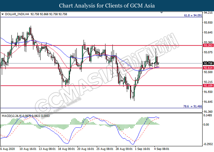 DOLLAR_INDX, H4: Dollar index was traded lower following prior retracement near the resistance level at 93.25. MACD which illustrated diminishing bullish momentum suggest the index to extend its losses toward the support level at 92.60.