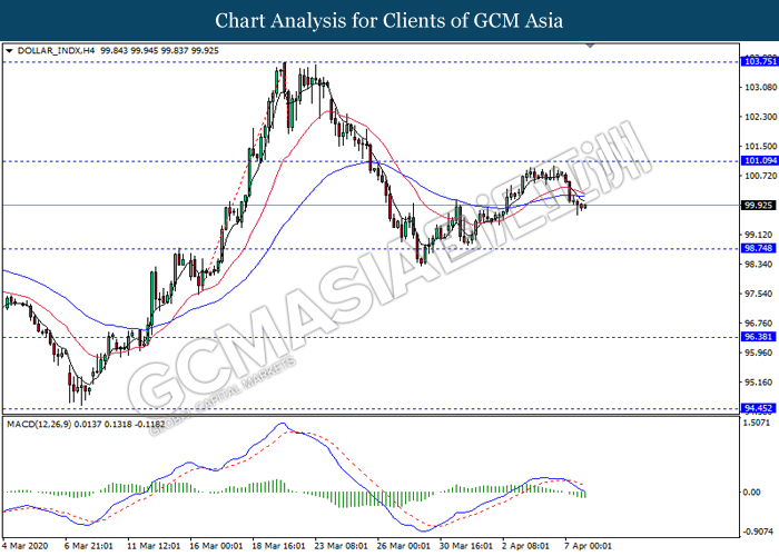 DOLLAR_INDX, H4: Dollar index was traded lower following prior retracement from the resistance level 101.10. MACD which illustrate bearish momentum signal with the formation of death cross suggest the dollar to extend its losses towards the support level 98.75.