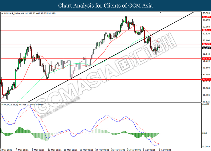 DOLLAR_INDX, H4: Dollar index was traded higher while currently testing the resistance level at 92.50. MACD which illustrated diminishing bearish momentum suggest the index to extend its gains after it successfully breakout above the resistance level.