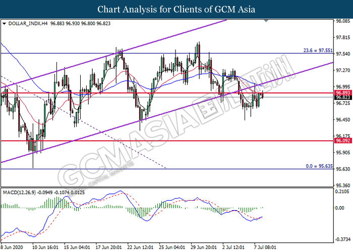 DOLLAR_INDX, H4: Dollar index was traded lower following prior retracement from the resistance level at 96.90. However, MACD which illustrate bullish bias momentum signal suggest the pair to undergo technical correction in short term.