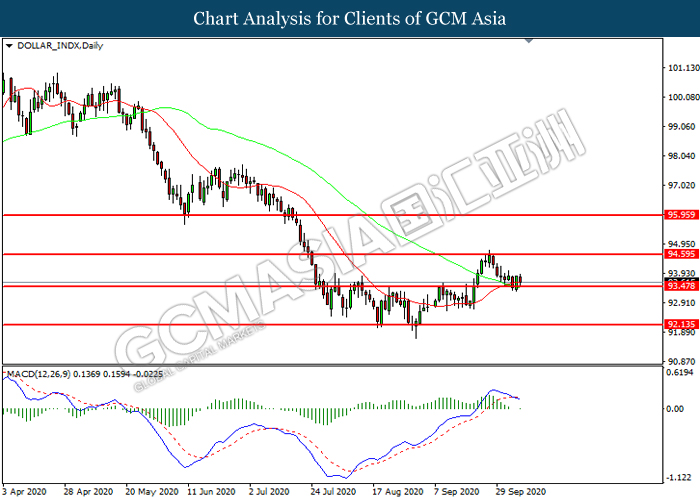 DOLLAR_INDX, Daily: Dollar index was traded lower while currently testing the support level at 93.45. MACD which illustrated increasing bearish momentum suggest the index to extend its losses after it successfully breakout below the support level.