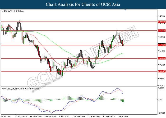 DOLLAR_INDX, Daily: Dollar index was traded lower while currently testing the support level at 92.00. MACD which illustrated increasing bearish momentum suggest the index to extend its losses toward support level at 90.80.