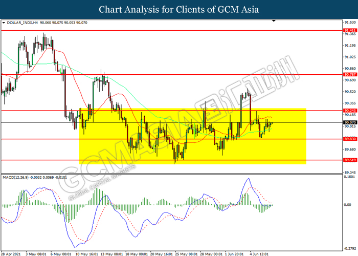DOLLAR_INDX, H4: Dollar index was traded higher following prior rebound from the support level at 89.85. MACD which illustrated diminishing bearish momentum suggest the index to extend its gains toward resistance level at 90.25.