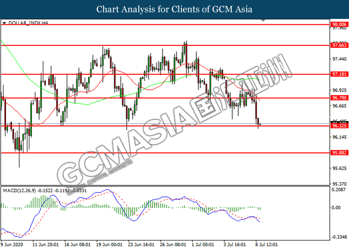 DOLLAR_INDX, H4: Dollar index was traded lower while currently testing the support level at 96.35. MACD which illustrated increasing bearish momentum suggest the index to extend its losses after it successfully breakout below the support level.