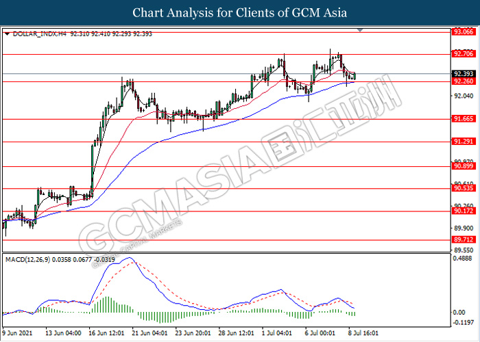 DOLLAR_INDX, H4: Dollar index was traded lower while currently testing near the support level 92.25. MACD which illustrate bearish bias signal suggest the dollar to extend its losses after it breaks below the support level.