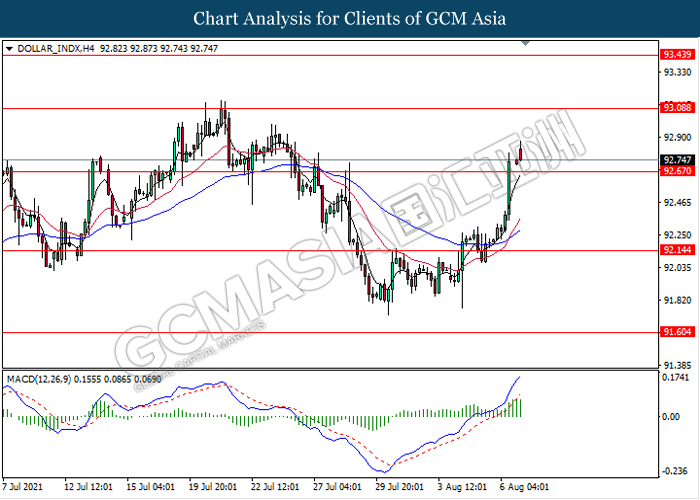 DOLLAR_INDX, H4: Dollar index was traded higher following prior breakout above the previous resistance level 92.65. MACD which illustrate persistent bullish momentum signal suggest the dollar to extend its gains towards the resistance level 93.10.