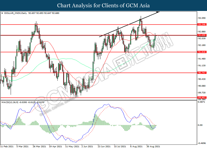DOLLAR_INDX, Daily: Dollar index was traded higher while currently testing the resistance level at 92.70. MACD which illustrated diminishing bearish momentum suggest the index to extend its gains after it successfully breakout above the resistance level.