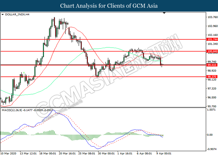 DOLLAR_INDX, H4: Dollar index was traded lower while currently testing the support level at 99.40. MACD which illustrated increasing bearish momentum suggest the index to extend its losses after it successfully breakout below the support level.