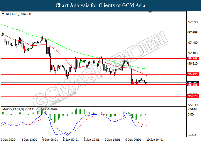 DOLLAR_INDX, H1: Dollar index was traded lower while currently testing the support level at 96.20. However, MACD which illustrated diminishing bearish momentum suggest the index to be traded higher in short-term as technical correction.