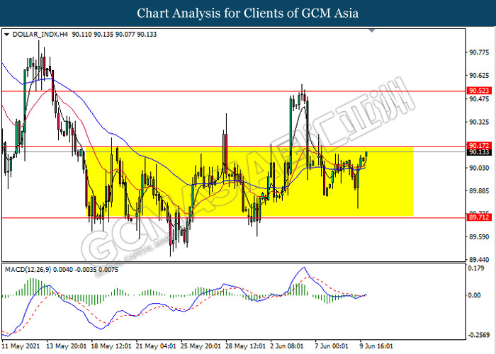 DOLLAR_INDX, H4: Dollar index remain traded in a sideway channel while currently testing near the resistance level 90.15. However, MACD which illustrate bullish bias signal with the formation golden cross suggest the dollar to be traded higher after it breaks above the resistance level.