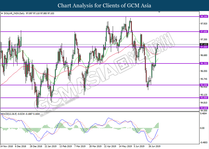 DOLLAR_INDX, Daily: Dollar index was traded higher following prior breakout above previous resistance level 97.00. MACD which display bullish momentum suggest index to extend its gains towards the resistance level 97.60.
