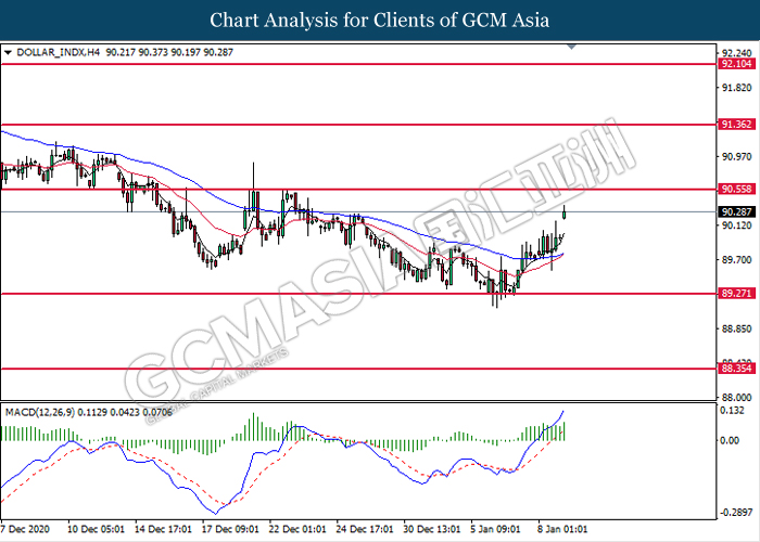 DOLLAR_INDX, H4: Dollar index was traded higher following prior rebound from the support level at 89.25. MACD which illustrated bullish bias momentum suggest the index to extend its gains toward the resistance level at 90.55.