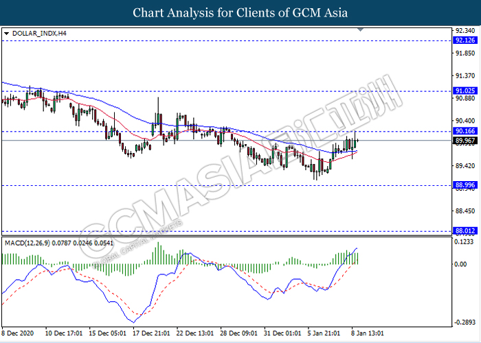 DOLLAR_INDX, H4: Dollar index was traded higher while currently testing near the resistance level 90.15. MACD which illustrate bullish momentum signal suggest the dollar to extend its gains after it breaks above the resistance level 90.15.