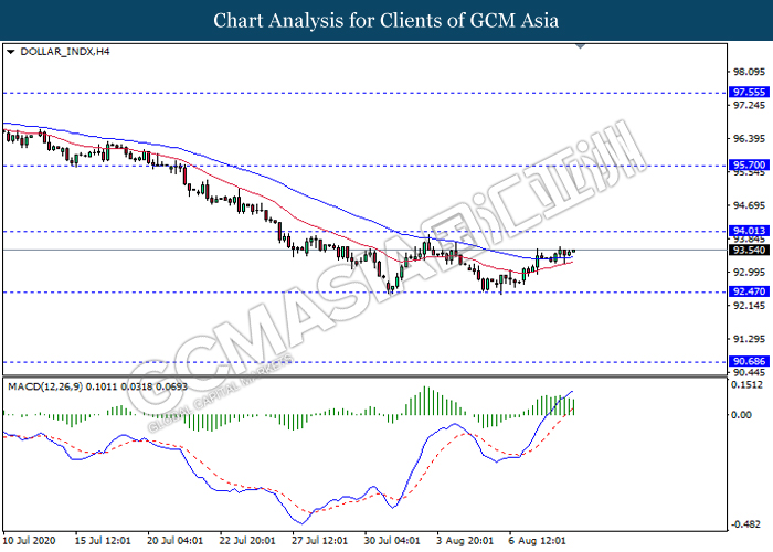 DOLLAR_INDX, H4: Dollar index was traded higher following recent rebound from the support level 92.45. However, MACD which illustrate diminishing bullish momentum signal suggest the dollar to experience a short term technical correction towards back the support level 92.45.