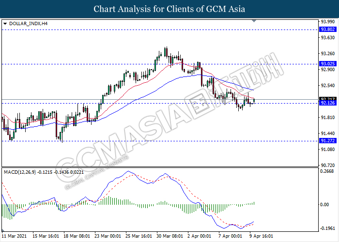 DOLLAR_INDX, H4: Dollar index was traded flat while currently testing the support level 92.10. However, MACD which illustrate bullish momentum signal with the formation of golden cross suggest the dollar to be traded higher towards the resistance level 93.00.