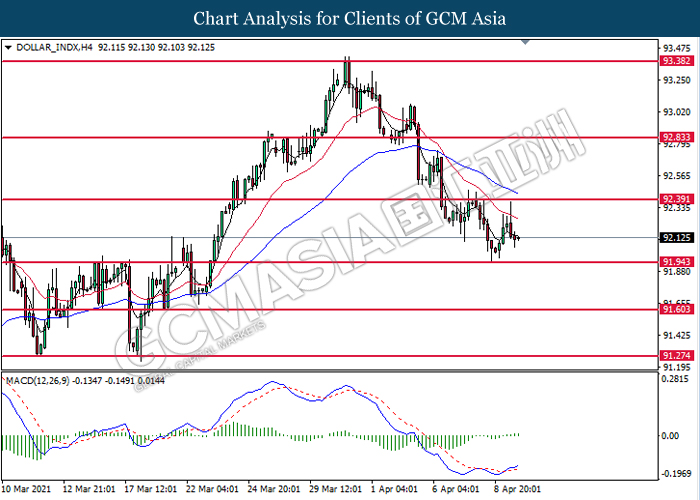DOLLAR_INDX, H4: Dollar index was traded lower following prior retracement from the resistance level at 92.40. MACD which illustrated diminishing bullish momentum suggest the index to extend its losses toward the support level at 91.95.