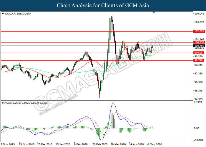 DOLLAR_INDX, Daily: Dollar index was traded higher following prior rebound from the support level at 99.60. MACD which illustrated increasing bullish momentum suggest the index to extend its gains toward resistance level at 100.80.