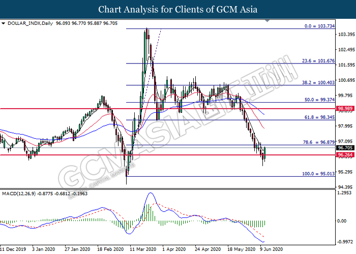 DOLLAR_INDX, Daily: Dollar index was traded higher following prior from the lower level. MACD which illustrate diminishing bearish momentum suggest the pair to extend its gains toward the resistance level at 96.90.