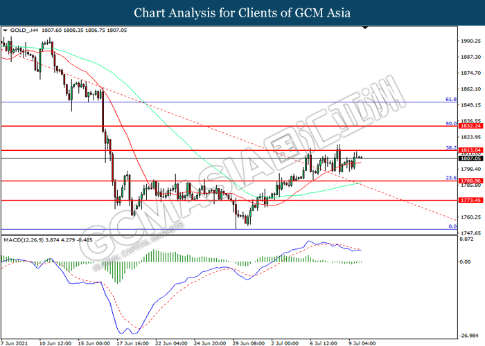 GOLD_, H4: Gold price was traded higher while currently testing the resistance level at 1813.05. MACD which illustrated diminishing bearish momentum suggest the commodity to extend its gains after it successfully breakout above the resistance level.
