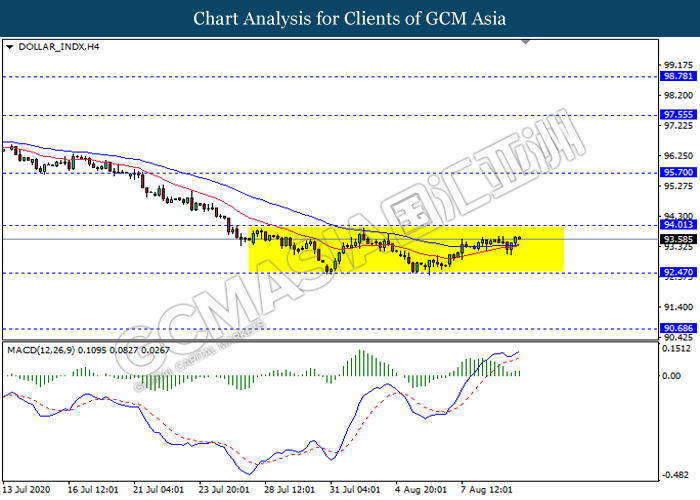 DOLLAR_INDX, H4: Dollar index remain traded in a sideway channel. However, MACD which illustrate bearish momentum signal suggest the dollar to be traded lower in short term towards the support level 92.45.