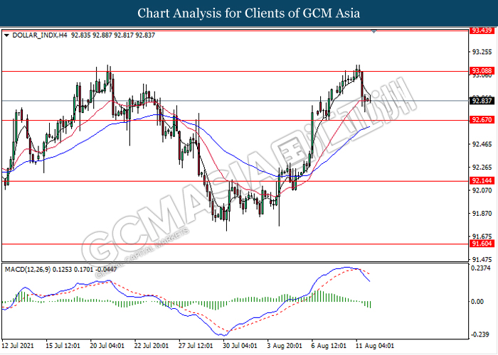 DOLLAR_INDX, H4: Dollar index was traded lower following prior retracement from the resistance level 93.10. MACD which illustrate bearish momentum signal with the formation of death cross suggest the dollar to extend its losses towards the support level 92.65.