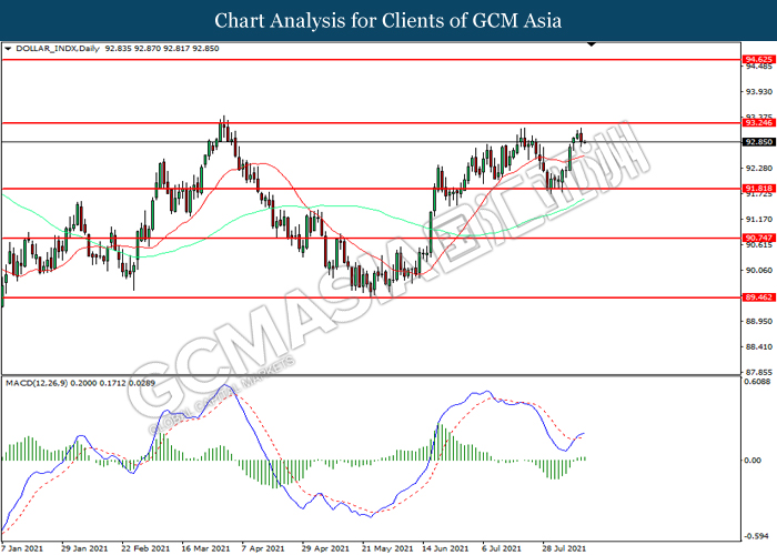DOLLAR_INDX, Daily: Dollar index was traded higher following prior rebound from the support level at 91.80. MACD which illustrated increasing bullish momentum suggest the index to extend its gains toward resistance level at 92.25.