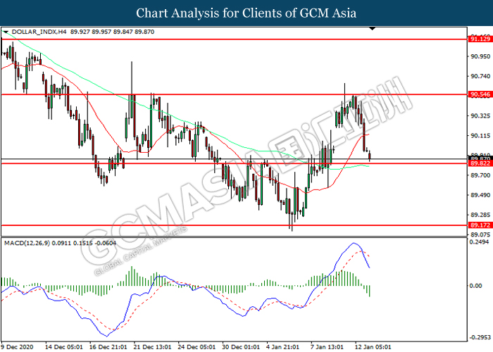 DOLLAR_INDX, H4: Dollar index was traded lower while currently testing the support level at 89.80. MACD which illustrated increasing bearish momentum suggest the index to extend its losses after it successfully breakout below the support level.