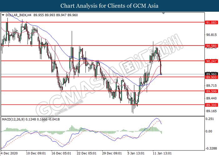 DOLLAR_INDX, H4: Dollar index was traded lower following prior breakout below the previous support level at 90.25. MACD which illustrated bearish momentum suggest the index to extend its losses toward the support level at 89.90.