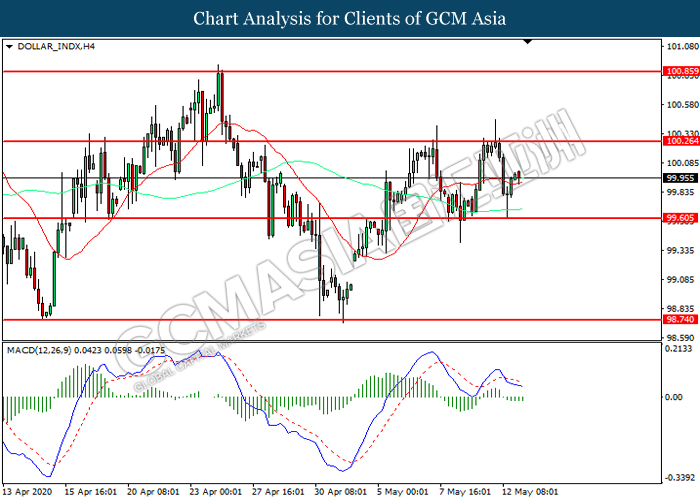 DOLLAR_INDX, H4: Dollar index was traded higher following prior rebound from the support level at 99.60. However, MACD which illustrated increasing bearish momentum suggest the index to be traded lower in short-term as technical correction.