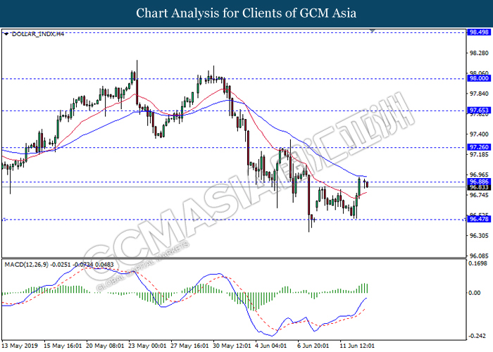 DOLLAR_INDX, H4: Dollar index was traded lower following recent retracement from the resistance level 96.90. MACD which illustrate diminishing bullish momentum suggest the dollar to extend its retracement towards the support level 96.45.