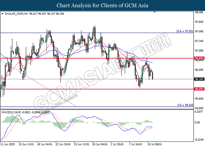 DOLLAR_INDX, H4: Dollar index was traded lower following prior retracement from the resistance level at 96.90. MACD which illustrate diminishing bullish momentum signal suggest the pair to extend its losses toward the support level at 96.10.