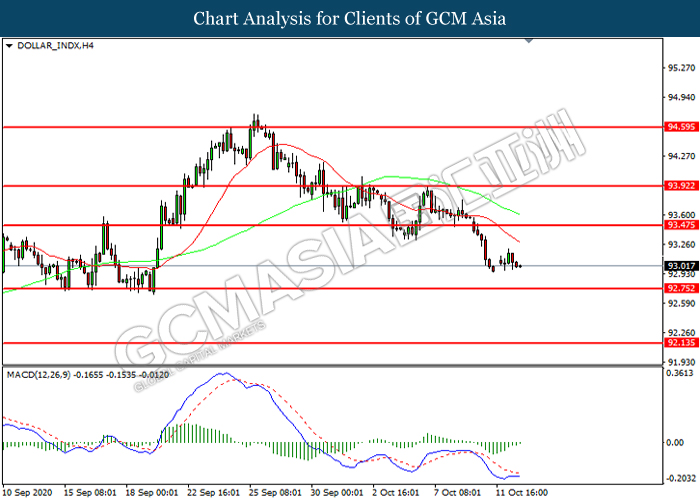 DOLLAR_INDX, H4: Dollar index was traded lower following prior breakout below the previous support level at 93.45. However, MACD which illustrated diminishing bearish momentum suggest the index to be traded higher in short-term as technical correction.