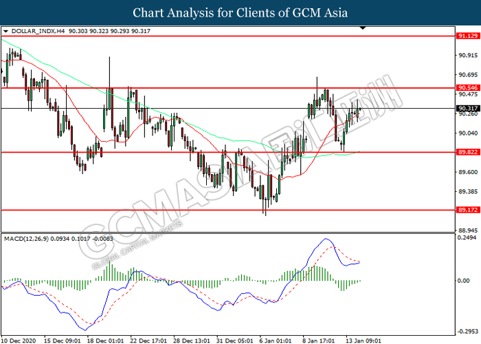 DOLLAR_INDX, H4: Dollar index was traded higher following prior rebound from the support level at 89.80. MACD which illustrated diminishing bearish momentum suggest the index to extend its gains toward resistance level at 90.55.