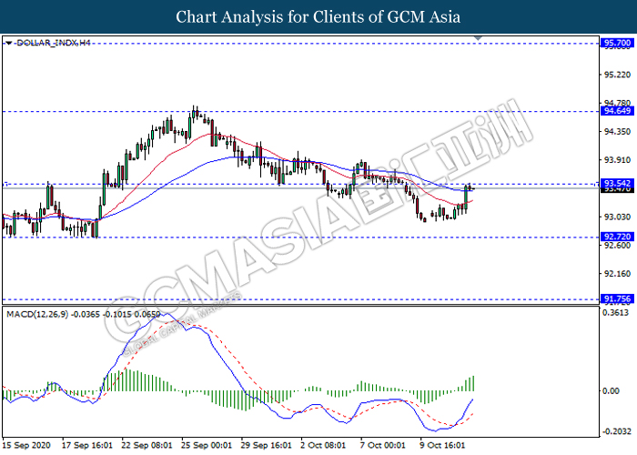 DOLLAR_INDX, H4: Dollar index was traded higher while currently testing the resistance level 93.55. MACD which illustrate bullish momentum signal with the recent formation of golden cross suggest the dollar to extend its gains after it breaks above the resistance level.