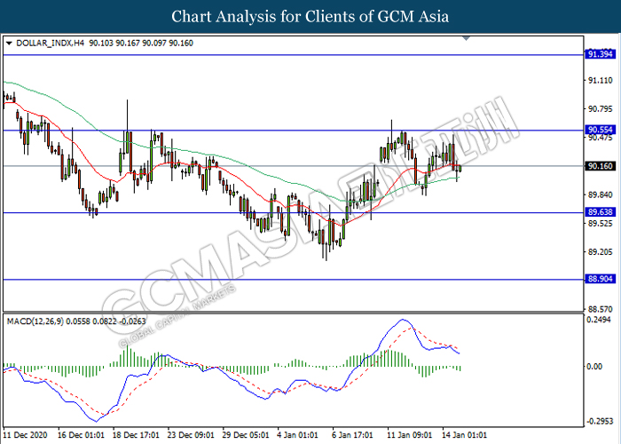 DOLLAR_INDX, H4: Dollar index was traded lower following recent retracement from the resistance level 90.55. MACD which illustrate bearish bias signal suggest the dollar to extend its retracement towards the support level 89.65.