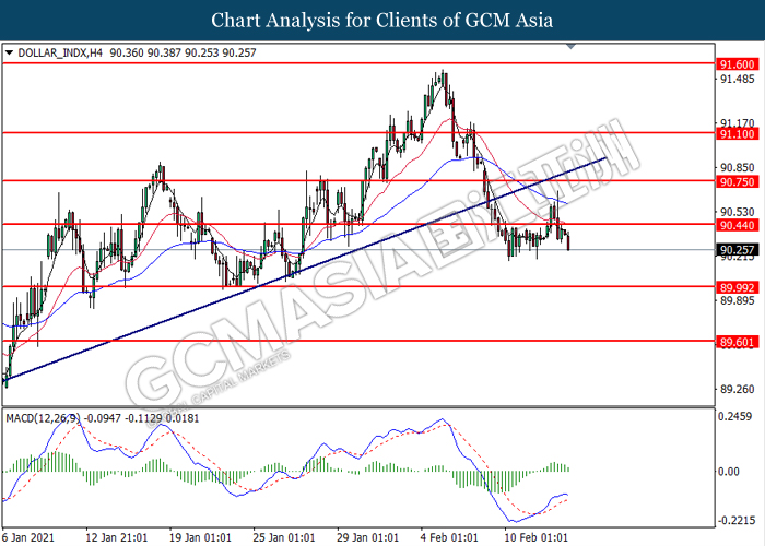 DOLLAR_INDX, H4: Dollar index was traded lower following prior breakout below the previous support level at 90.45. MACD which illustrated diminishing bullish momentum suggest the index to extend its losses toward the support level at 90.00.