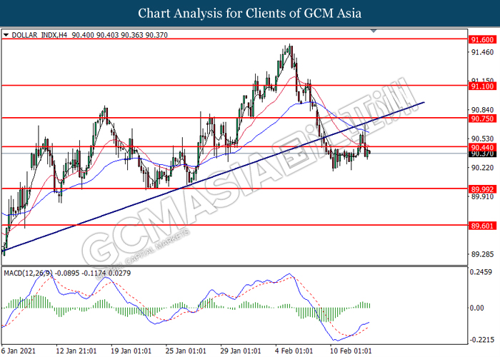 DOLLAR_INDX, H4: Dollar index was traded lower following prior breakout below the previous support level at 90.45. MACD which illustrated diminishing bullish momentum suggest the index to extend its losses toward the support level at 90.00.