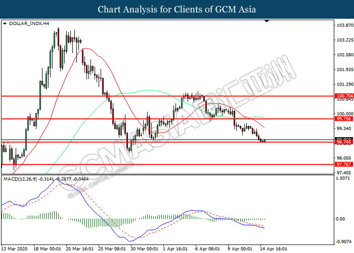 DOLLAR_INDX, H4: Dollar index was traded lower while currently testing the support level at 98.75. However, MACD which illustrated diminishing bearish momentum suggest the index to be traded higher in short-term as technical correction.