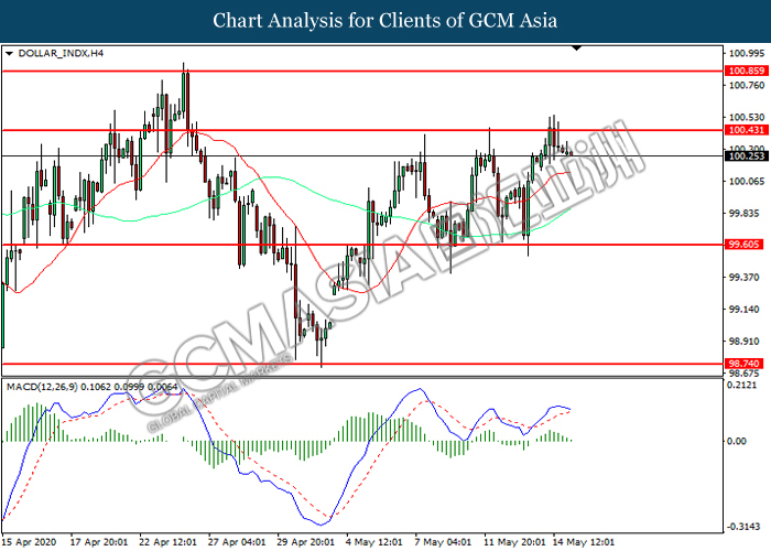DOLLAR_INDX, H4: Dollar index was traded lower following prior retracement from the resistance level at 100.45. MACD which illustrated diminishing bullish momentum suggest the index to extend its losses toward support level at 99.60