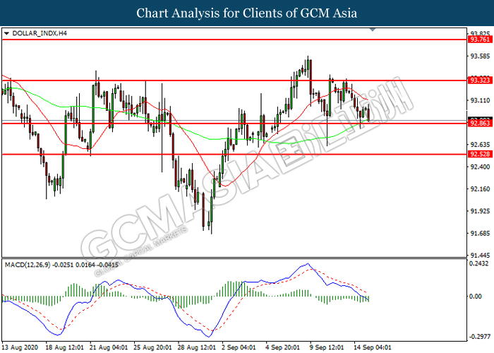 DOLLAR_INDX, H4: Dollar index was traded lower while currently testing the support level at 92.85. MACD which illustrated increasing bearish momentum suggest the index to extend its losses after it successfully breakout below the support level.
