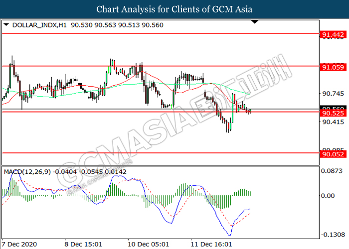 DOLLAR_INDX, H1: Dollar index was traded lower while currently testing the support level at 90.55. MACD which illustrated diminishing bullish momentum suggest the index to extend its losses after it successfully breakout below the support level.