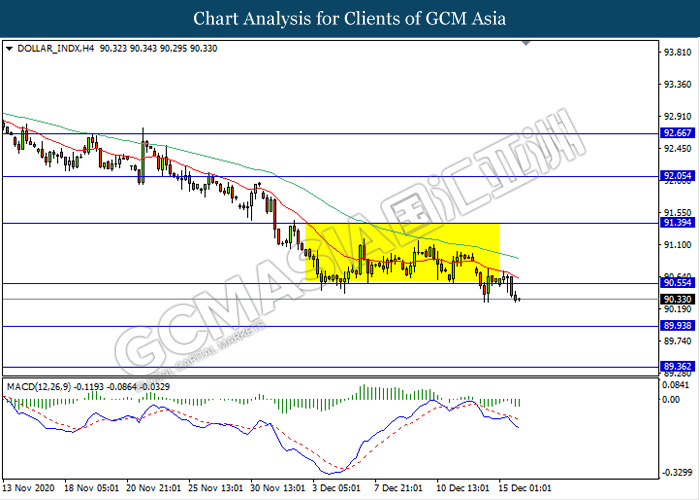 DOLLAR_INDX, H4: Dollar index was traded lower following prior breakout below the previous support level 90.55. MACD which illustrate bearish momentum signal suggest the dollar to extend its losses towards the support level 89.95.