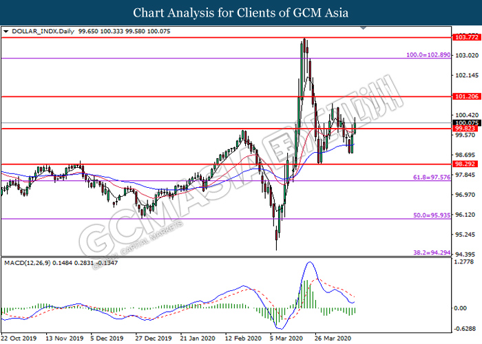 DOLLAR_INDX, DailyDollar index was traded higher while currently testing the resistance level near 99.80. MACD which illustrate diminishing bearish momentum suggest the dollar to extend its gains after it successfully breakout above the resistance level.