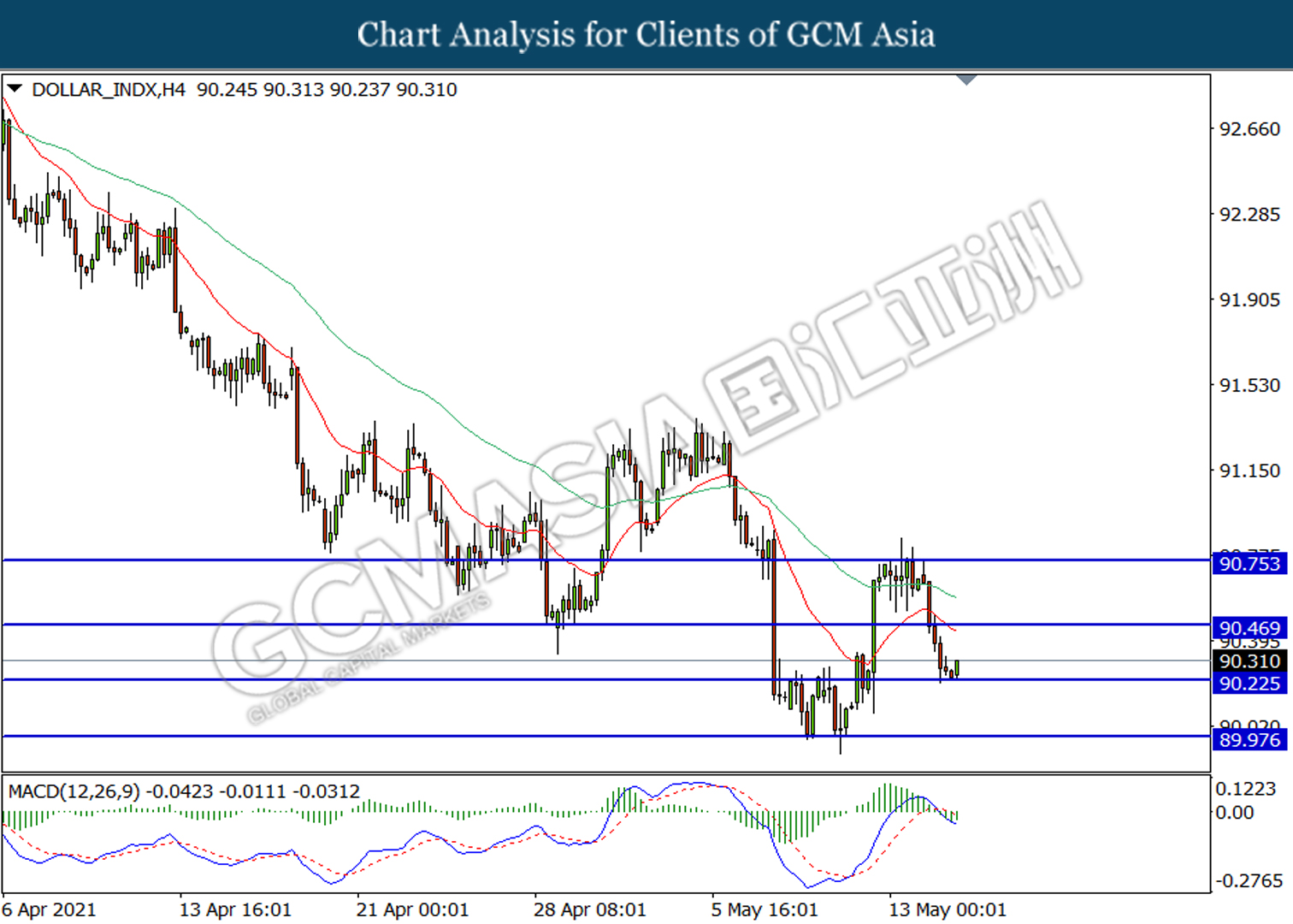 DOLLAR_INDX, H4: Dollar index was traded lower following prior retracement from the resistance level at 90.75. MACD which illustrated formation of bearish momentum suggest the index to extend its losses after breaking the support level at 90.20.