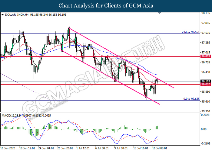 DOLLAR_INDX, H4: Dollar index was traded higher while currently testing the top level of downward channel. MACD which illustrate bullish momentum signal suggest the pair to extend its gains after it successfully breakout above the top level of downward channel.