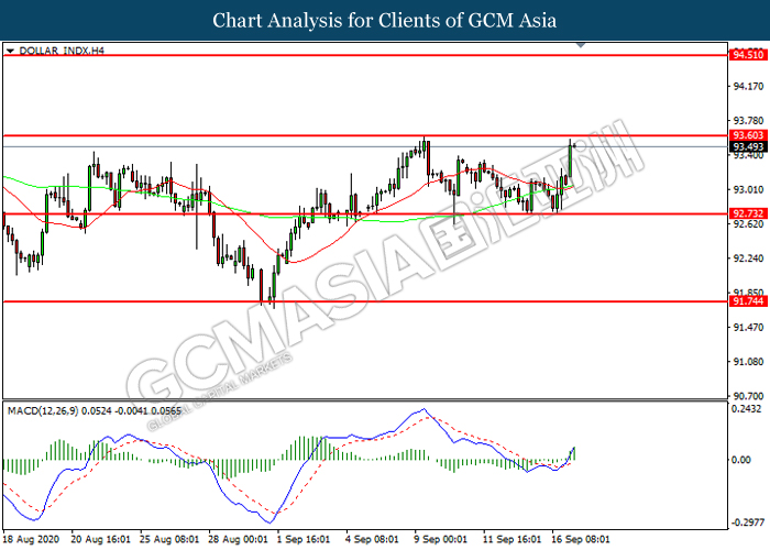 DOLLAR_INDX, H4: Dollar index was traded higher while currently testing the resistance level at 93.60. MACD which illustrated increasing bullish momentum suggest the index to extend its gains after it successfully breakout above the resistance level.