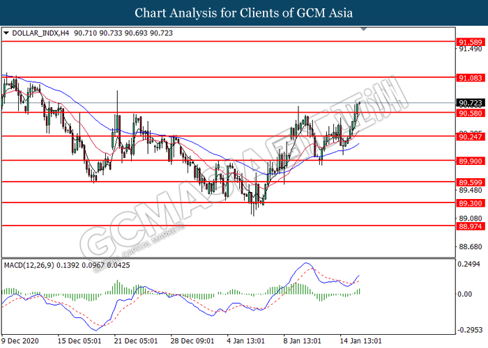 DOLLAR_INDX, H4: Dollar index was traded higher following prior breakout above the previous resistance level at 90.60. MACD which illustrated bullish momentum suggest the index to extend its gains toward the resistance level at 91.10.