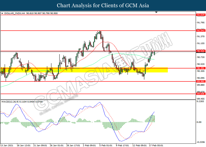 DOLLAR_INDX, H4: Dollar index was traded higher while currently testing the resistance level at 90.90. However, MACD which illustrated diminishing bullish momentum suggest the index to be traded lower in short-term as technical correction.