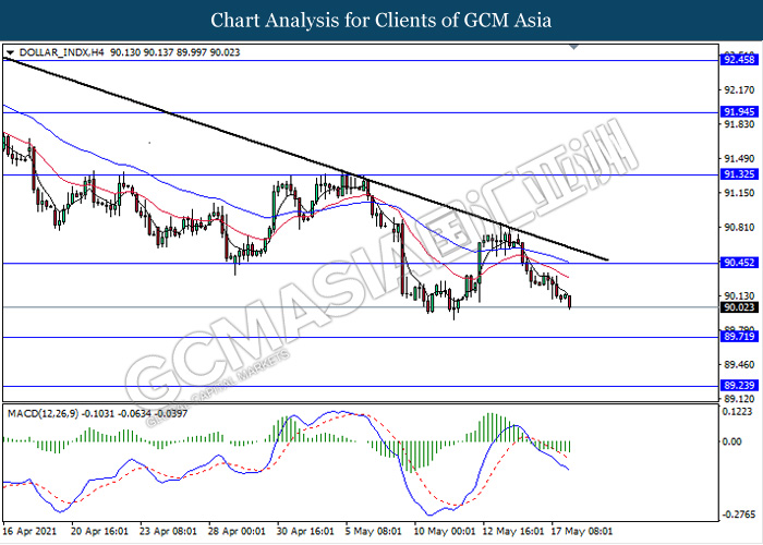 DOLLAR_INDX, H4: Dollar index was traded lower following recent breakout below the previous support level 90.45. MACD which illustrate persistent bearish momentum signal suggest the dollar to extend its losses towards the support level 89.70.