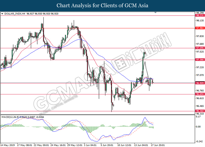 DOLLAR_INDX, H4: Dollar index was traded lower while currently testing the support level at 96.90. MACD which illustrate bearish bias signal suggest index to extend its losses after successfully breakout below the support level at 96.90.